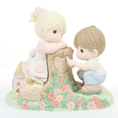 • The nostalgic scene features a young boy and girl at a tree stump carved with "You -n- Me," accompanied by a picnic basket and a jug, symbolizing the enduring beauty of friendship and shared moments.