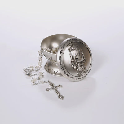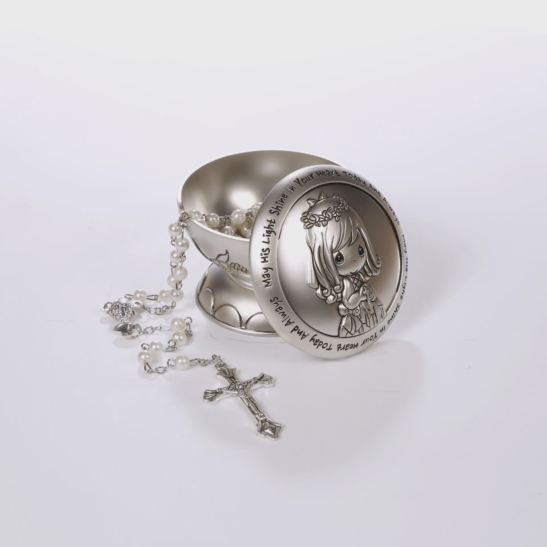 - This beautifully detailed zinc alloy rosary box includes a lovely faux pearl rosary and features a Precious Moments communion girl and an inspirational prayer for God’s light to shine in her heart.